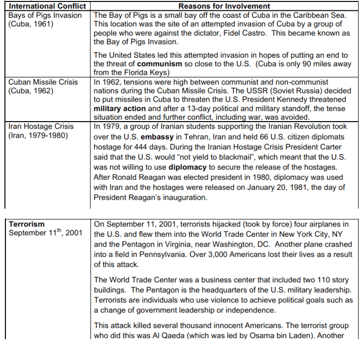 Describe examples of how the United States has dealt with international conflicts.